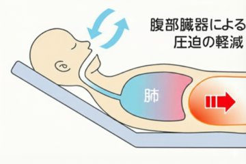 呼吸器疾患の方は仰臥位で寝ていると横隔膜が内臓に圧迫されて動きが制限されるため、呼吸しにくい状態になります(イメージ①)。そこで上体ギャッチアップによって上半身を上げることによって内臓が下がるため、横隔膜への圧迫が避けられ呼吸しやすくなります(イメージ②)。