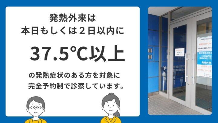 当院では、本日もしくは2日以内に37.5度以上の発熱がある方につきましては、完全予約制での診察とさせていただいております。