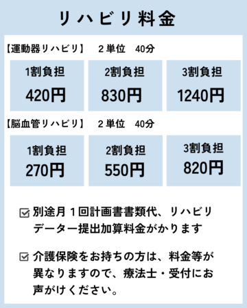 A.基本的に1~2回/週となります。1回あたりのリハビリ時間は40分間です。