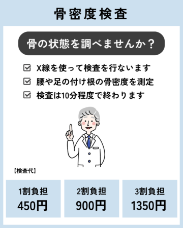 骨の強さを調べるには、「骨密度検査」や「血液検査」を行います。これらの検査で骨の健康状態をチェックすることができます。